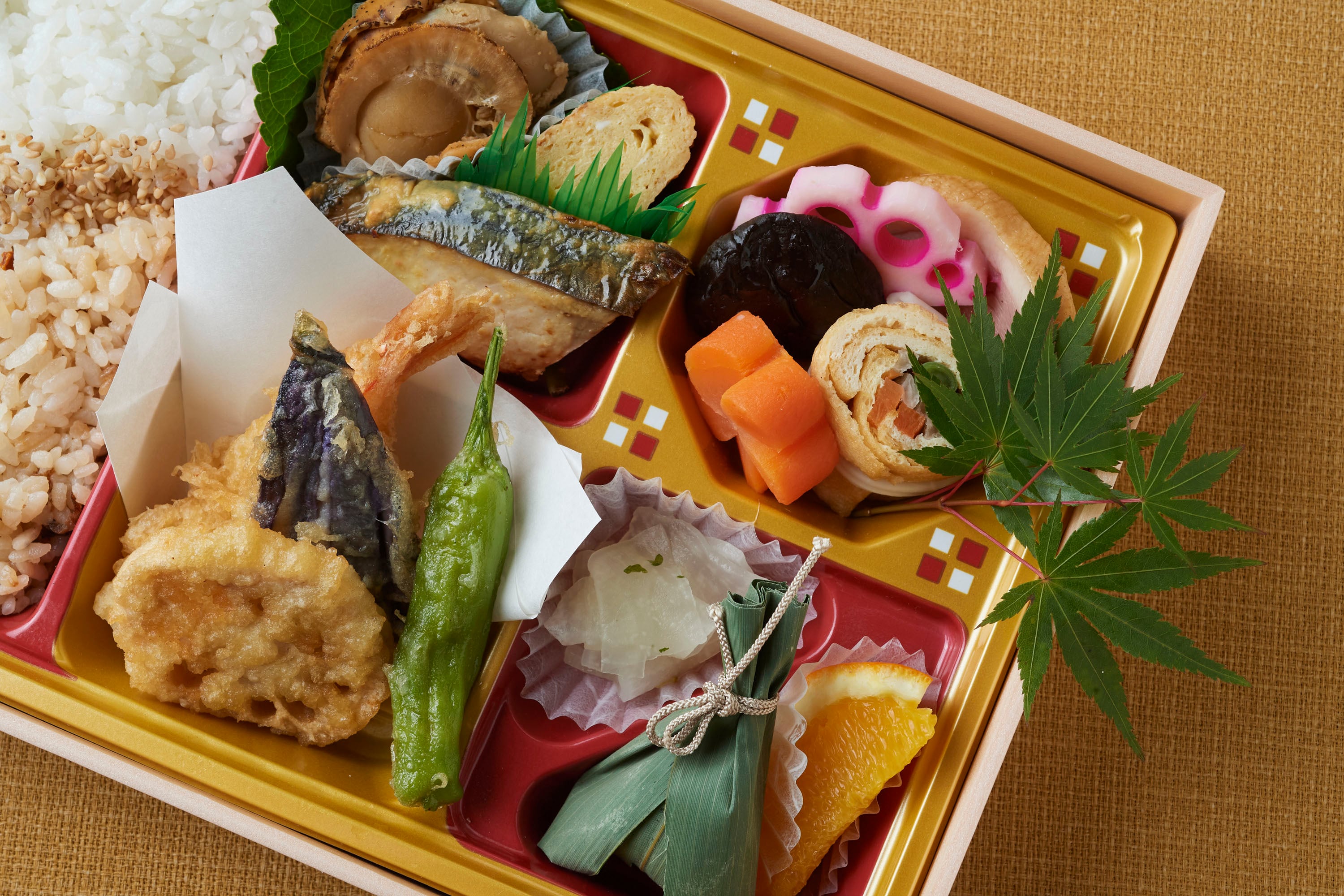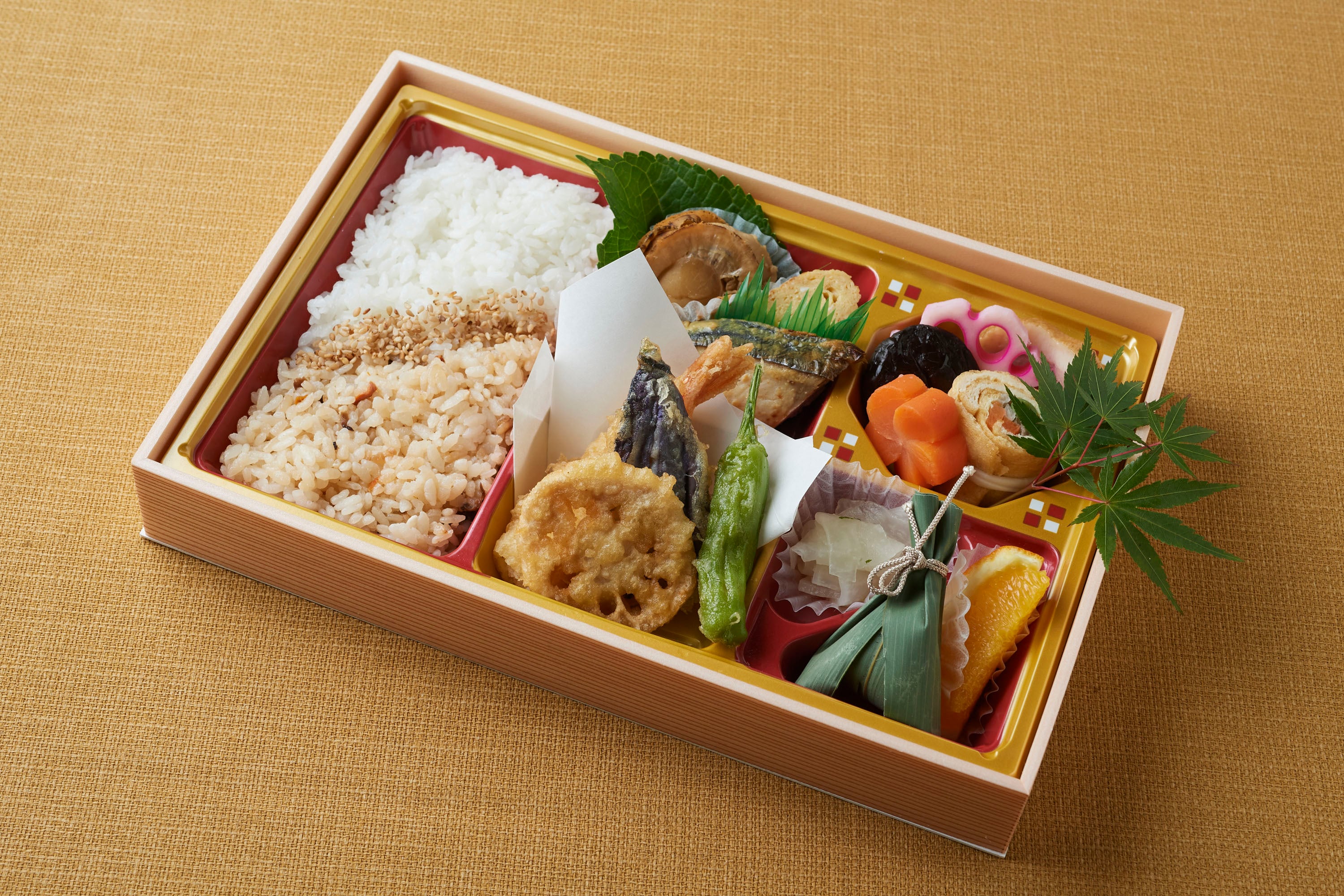 季節の天ぷらや煮物、焼き物をお詰めするスタンダードなお弁当です。